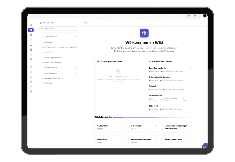 Das Wiki in Kibi Connect ist Ihr zentraler Ort für Unternehmensinformationen und Dokumentationen. Hier können Wissen und Anleitungen strukturiert gespeichert und durch verschiedene Sicherheitsoptionen geschützt werden: Sie können den Zugriff auf bestimmte Gruppen oder Benutzer beschränken, Inhalte nur im Firmennetzwerk verfügbar machen, sensible Informationen per PIN schützen oder ausgewählte Inhalte über einen geschützten Link mit externen Partnern teilen.