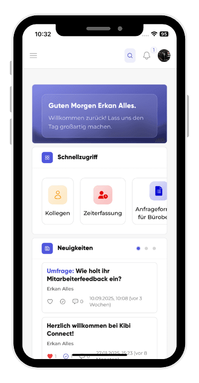 Verpasst nie wieder wichtige Meetings oder Events! Der Kibi Connect Kalender hält euer Team synchron – von Betriebsversammlungen über Projektdeadlines bis hin zum Sommerfest. Erstellt Termine, ladet Kollegen ein und behaltet den Überblick über alles, was in eurem Unternehmen passiert.