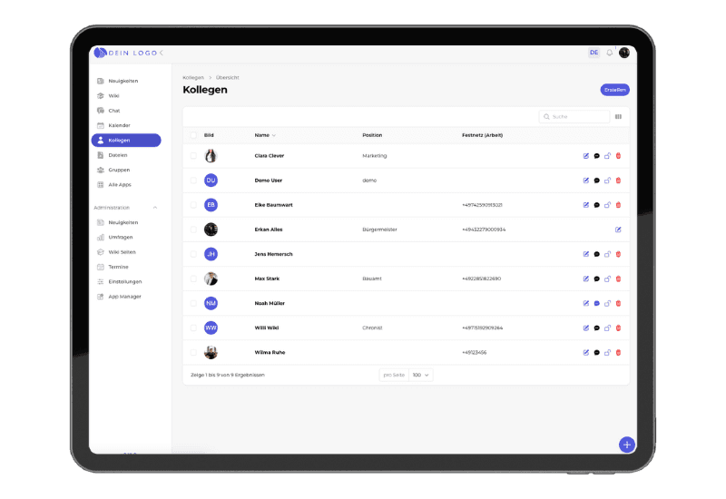 Lernt euch besser kennen! In der Kollegen-Übersicht findet ihr alle Teammitglieder mit ihren Kontaktdaten, Positionen und persönlichen Infos. Perfekt für neue Mitarbeiter, die sich orientieren möchten, oder um schnell den richtigen Ansprechpartner zu finden.