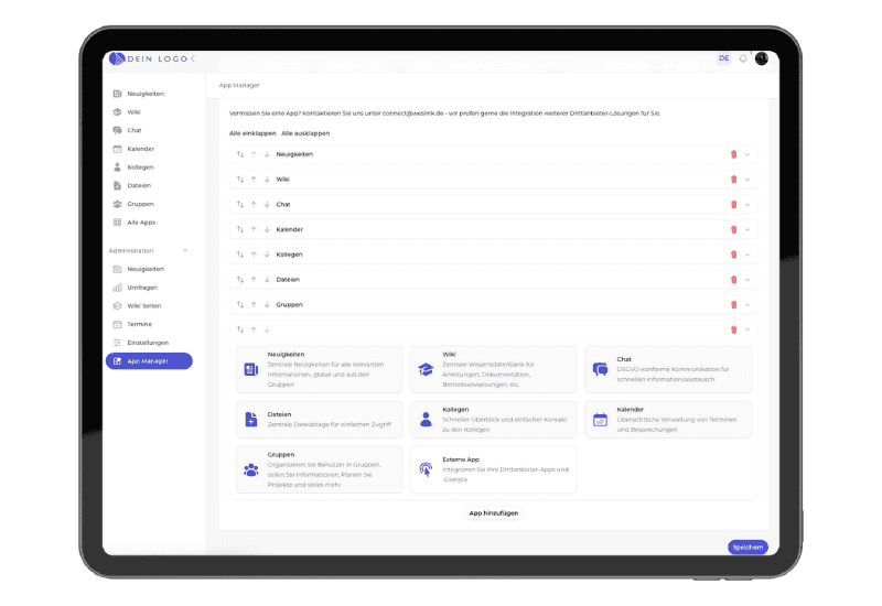 Gestalten Sie Kibi Connect ganz nach Ihren Bedürfnissen: Neben der flexiblen Verwaltung der integrierten Funktionen können Sie auch externe Apps und Dienste nahtlos einbinden. Die Integration erfolgt einfach über eine URL, die Sie mit einem passenden Icon und Ihrer Wunschfarbe personalisieren. Dabei haben Sie volle Kontrolle über die Zugriffsrechte, Anzeigeoptionen und Platzierung in der Benutzeroberfläche. Legen Sie fest, welche Rollen die App nutzen dürfen, ob sie in einem neuen Tab geöffnet werden soll und ergänzen Sie eine passende Beschreibung für Ihre Mitarbeitenden.